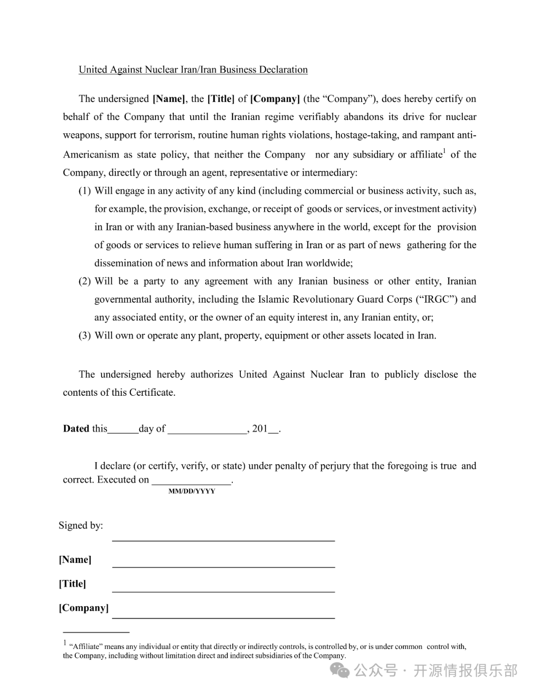 以下簽名的[姓名],即[公司](“公司”)的[職務],特此代表公司證明,在伊朗政權明確放棄其核武器、支持恐怖主義、常規侵犯人權、劫持人質和猖獗的反美主義作為國家政策之前,公司或公司的任何子公司及關聯公司,均不得直接或通過代理人,代表或中介。