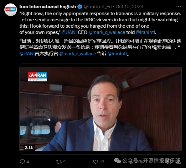 如果對馬克·華萊士希望看到什麼樣的“戲劇性反應”有任何疑問,他向伊朗伊斯蘭革命衞隊(Islamic Revolutionary Guard Corps)補充了一條信息:“我期待看到你被吊在你自己的繩索末端。”