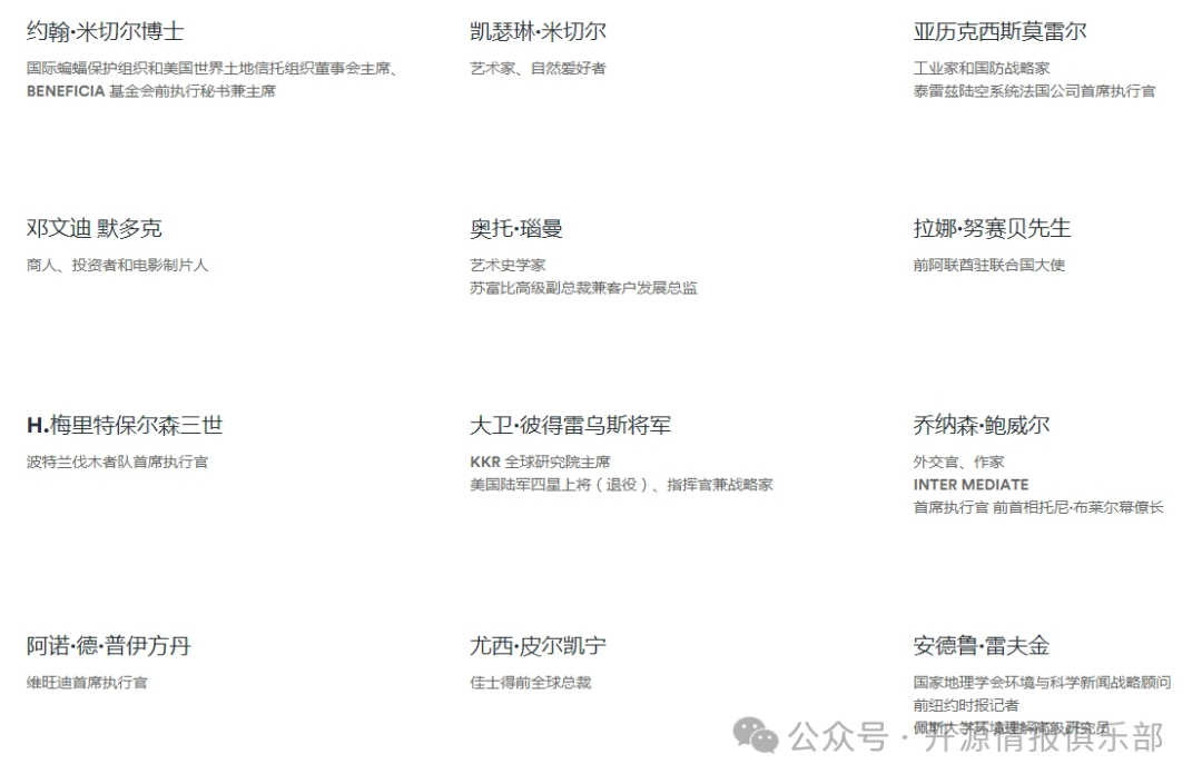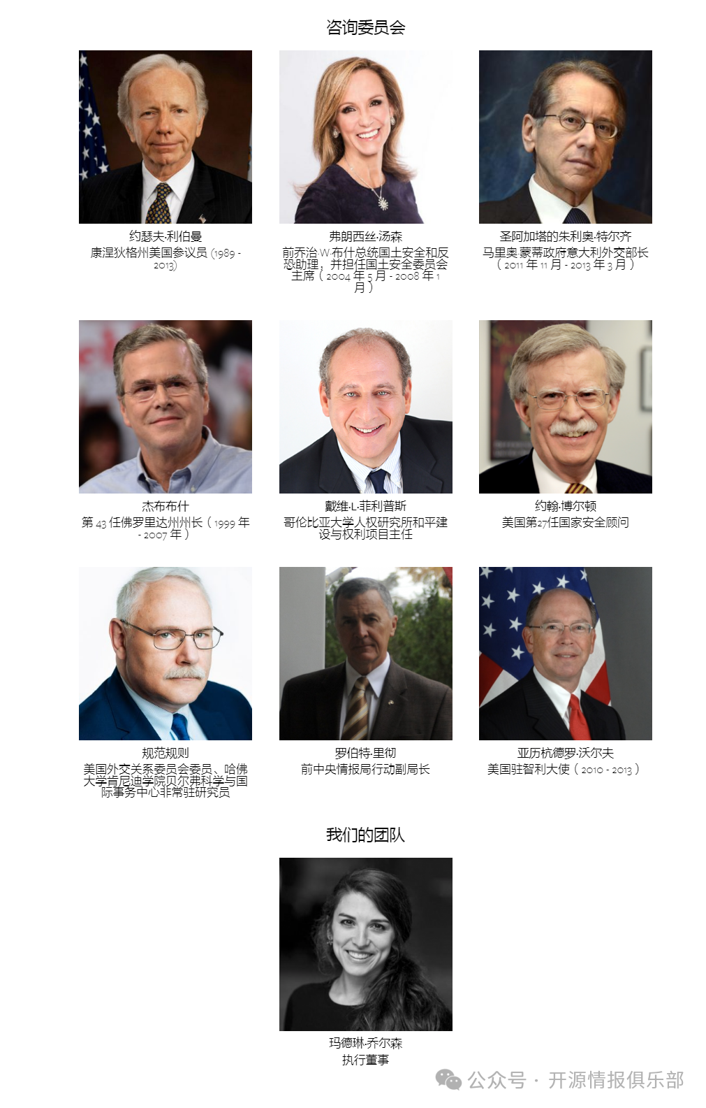 此外,著名的前董事會成員包括前中央情報局局長小羅伯特·詹姆斯·伍爾西(R.James Woolsey);2002年至2011年期間擔任摩薩德局長的梅爾·達根(Meir Dagan);以及曾任英國間諜機構軍情六處(MI6)局長的理查德·迪爾洛夫爵士(Richard Dearlove)。