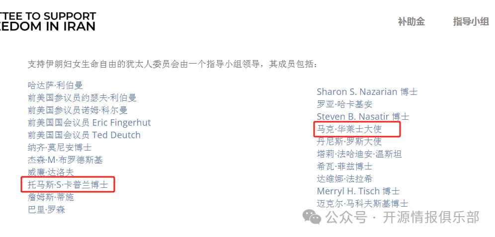 支持伊朗女性生活自由的猶太委員會(JCWLF)指導小組的成員——包括華萊士和卡普蘭——也領導着UANI。其他人員包括不少前美國國會議員。