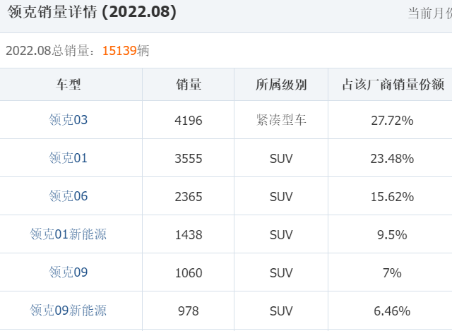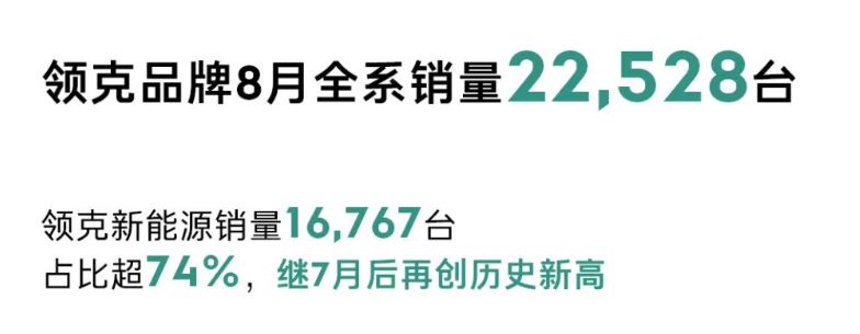今年 8 月,領克品牌一共賣了 2.25 萬輛,裏頭新能源車型有 1.67 萬,佔比超過 74% 。賣得最好的兩款車領克 07 、 08 ,都是新能源。