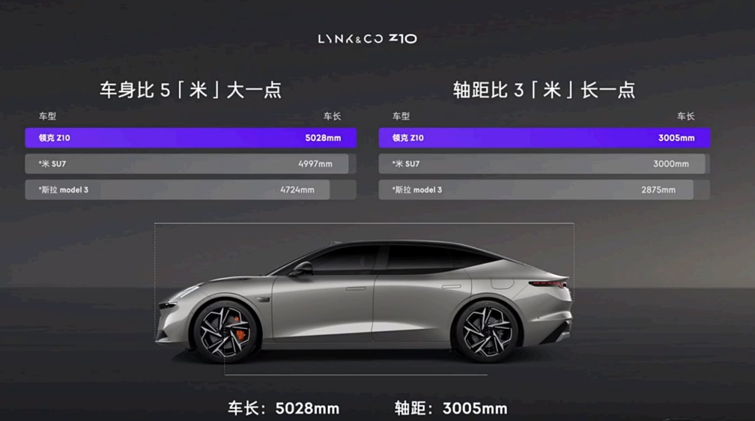 Z10 誕生於吉利的看家法寶—— SEA 浩瀚架構,是一台長 5 米、軸距 3 米的標準 C 級車,和小米 SU7 一般大。極氪 001 、銀河 E8 都誕生於這個平台,它們仨也算親兄弟了。