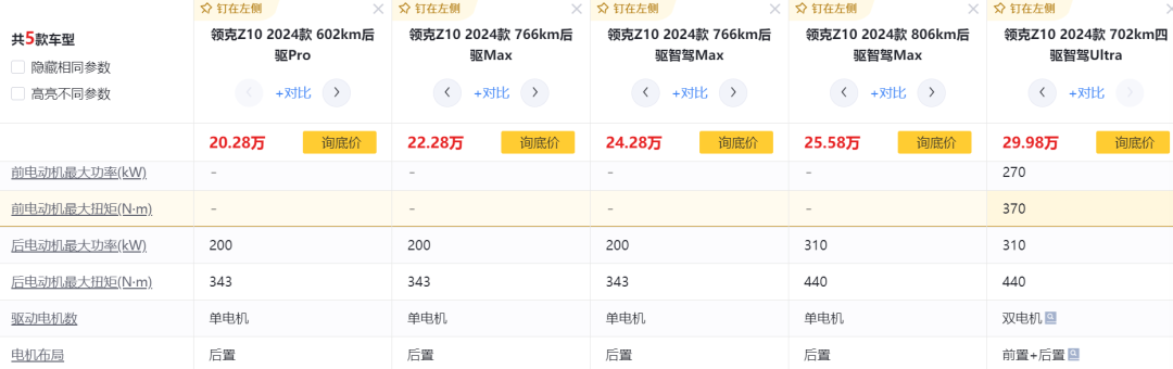Z10 四驅車型的電機功率是 580kW (前 270kW+ 後 310kW ),和極氪 001 一模一樣,但它全系都是磷酸鐵鋰,零百加速 3.5s ,而極氪 001 的三元鋰版本能做到 3.3s 。
