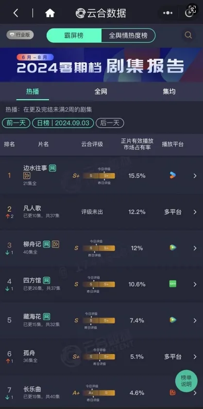 雲合數據顯示,《邊水往事》牢牢佔據連續劇熱播榜第一,全網正片有效播放市場佔有率達15.5%。