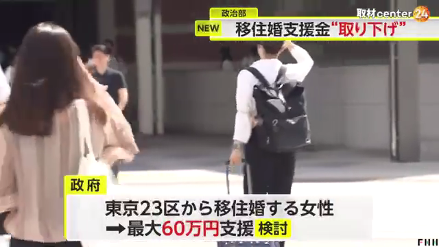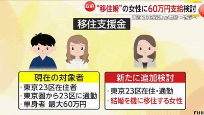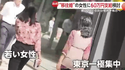 前陣子,日本政府想到了一個“一舉兩得”的“好辦法”,新政策僅針對居住或在東京23區上班的女性,如果以結婚為契機移居到的鄉下,即使沒有就業計劃也能獲得政府提供的最大60萬日元補貼