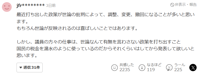 雖然輿論能夠影響政策是件好事,但議員們的工作應該是提出那些不會引發輿論的政策。既然是使用納税人的錢,就應該在發佈之前做好充分的準備和考量。