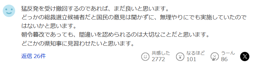 如果在受到強烈反對後能夠撤回決定,那還算是好的。相較於某些候選人可能無視民意強行推進政策,即使朝令夕改,能夠承認錯誤依然很重要。希望某些地方的知事能以此為借鑑。