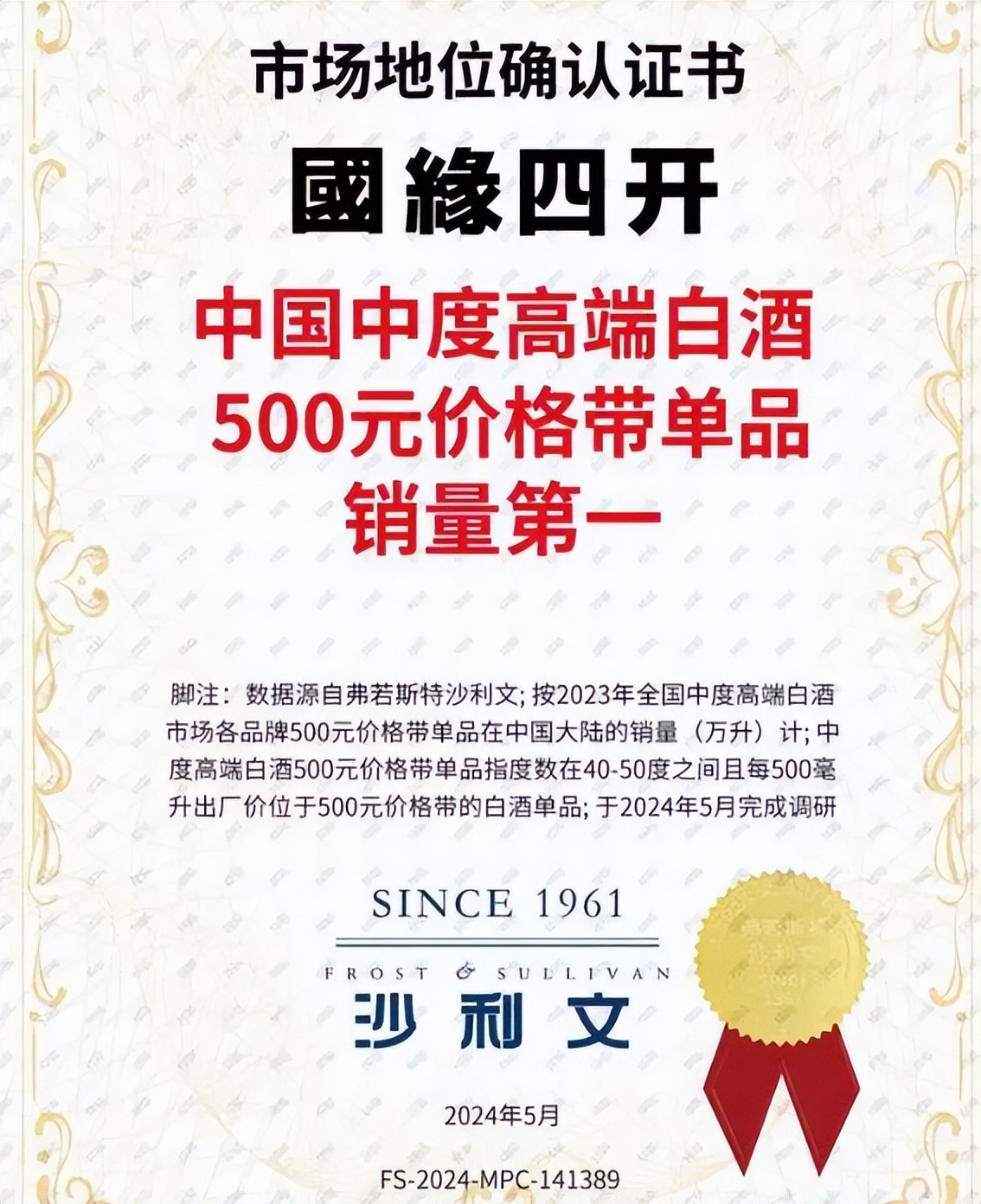 彼時,網傳的一份來自“連網”的“市場地位確認證書”顯示,今世緣國緣四開產品在中國中度高端白酒500元價格帶單品銷量第一。
