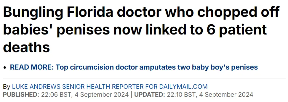 最近美國佛州一名叫Berto Lopez醫生被爆:2021年在為一名新生兒做包P環切手術時,竟將新生兒命根子一整個給切了下來。