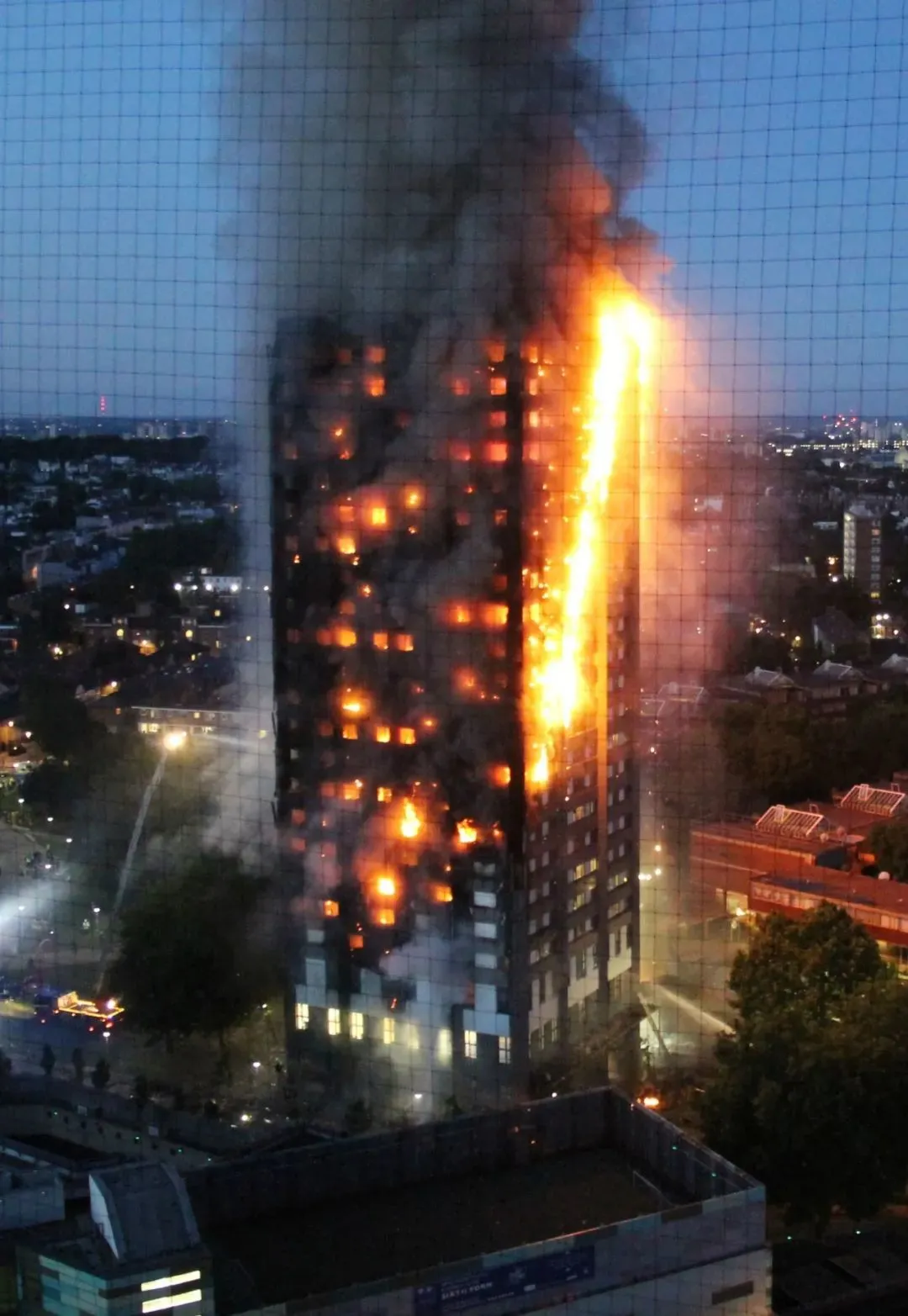 這時,格蘭菲爾大廈東側的很多排風扇和窗框都已經着火了,還有一平方米大小的包層面板着着火從大廈外牆上掉下去。
