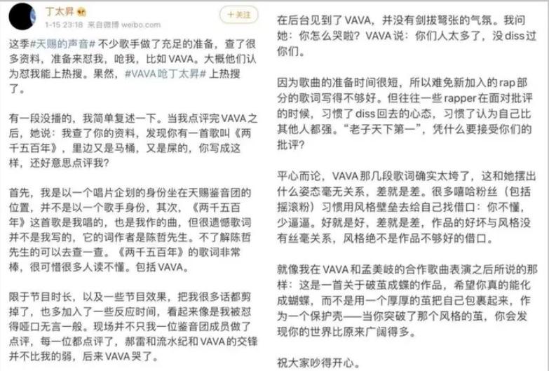 《天賜的聲音2》第一期開播時,丁太升批評VAVA的歌詞空洞引來交戰,上了熱搜。節目播出後,受到了半個説唱圈的回擊。