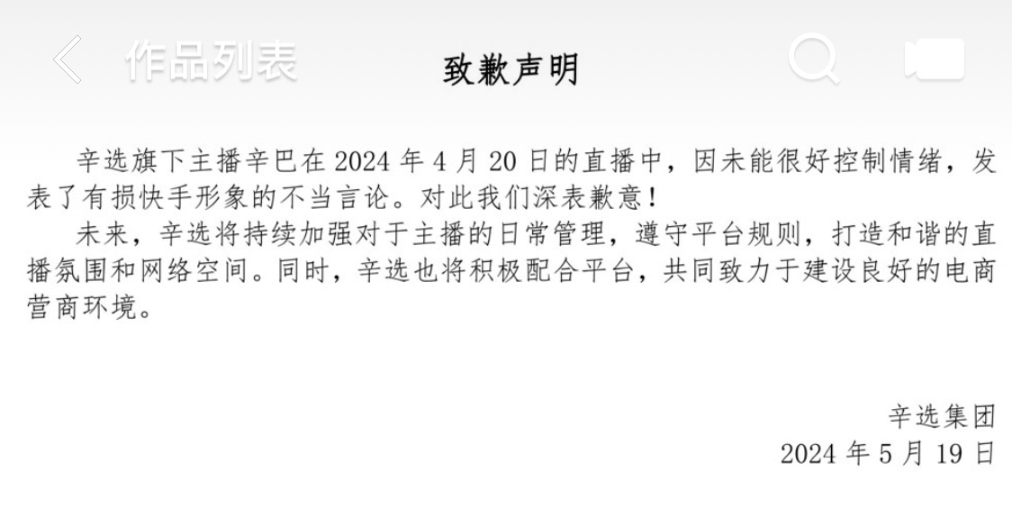 實際上,辛巴參與的直播間“罵戰”不在少數。4月20日,辛巴在快手平台開啓直播後,針對快手平台對“碰瓷”主播的縱容行為火力全開。辛巴首次公開點名道姓,把矛頭對準了情感主播“太原老葛”和“馬洪濤”。情緒越來越激動的辛巴大罵平台,因言論出格,導致直播間被封禁。“辛有志”賬號被封禁後,辛巴迅速換上辛選旗下中小主播賬號開播,但很快再次因過激言論違反社區規則而被封禁。直到5月19日,辛選官方發表聲明,對旗下主播辛巴直播中對平台的不當言論表示歉意,辛巴才被快手解封。