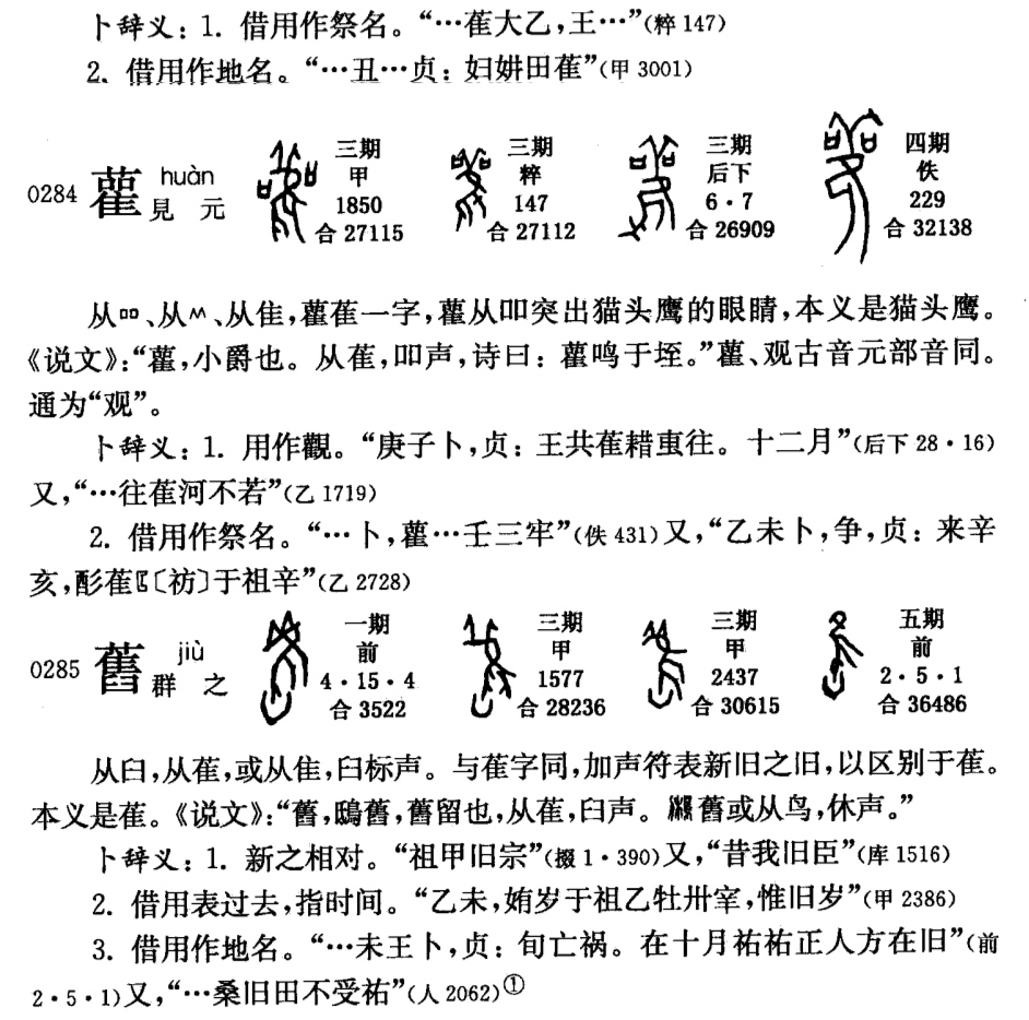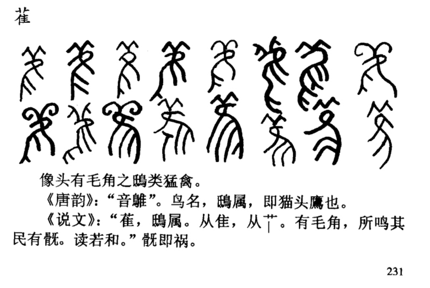 甲骨文、金文【雈(鴅huān🦉)、雚(叫聲獨特有如笑)、瞿(貓頭鷹🦉正面雙目大,能夜視)】互為異體分化字。《詩·豳風·東山》雚鳴於垤,婦嘆於室。