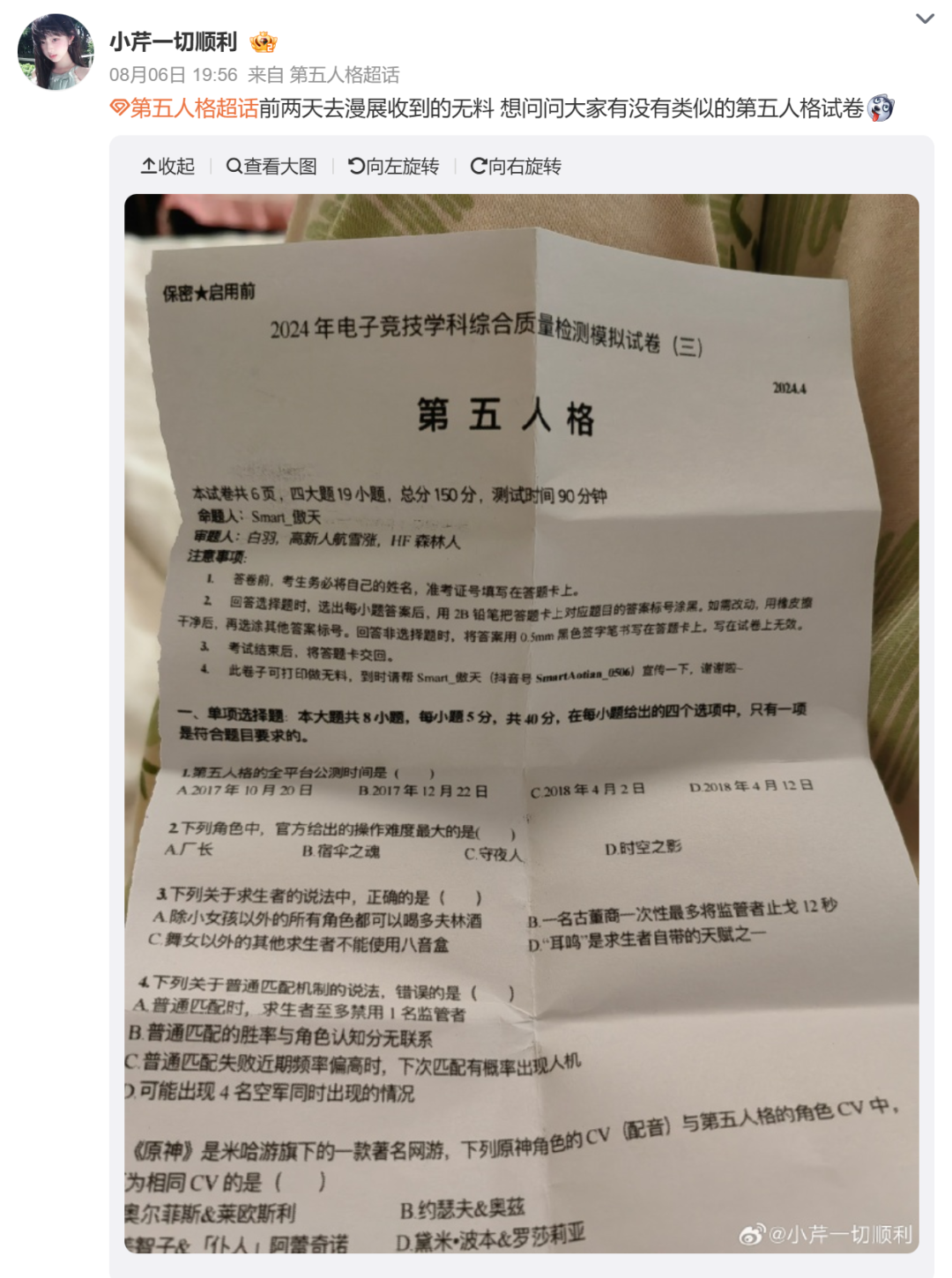 在漫展用無料學習甚至都不是難事,發放試卷,現已成為人人通用的“玩梗類無料”行列。語數外、政史地、理化生,總有一款試卷不經意地出現在某場漫展,收到的人回家覆盤時,往往先是震驚然後會心一笑,轉頭到社媒發佈這件趣事。就連定製試卷也已成常態,我們無法統計到底有多少愛好者領到過同好精心製作的試卷,可以肯定的是,每個熱門興趣圈子都有自己的模擬考試。