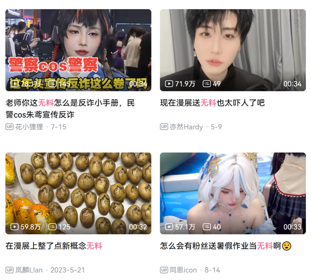 原本參加漫展前準備無料這件事,就是全憑自願“為愛發電”的環節,然而如今打開視頻網站搜索關鍵詞,就會發現大家對無料的重視程度越來越高,內卷的趨勢越發明顯。