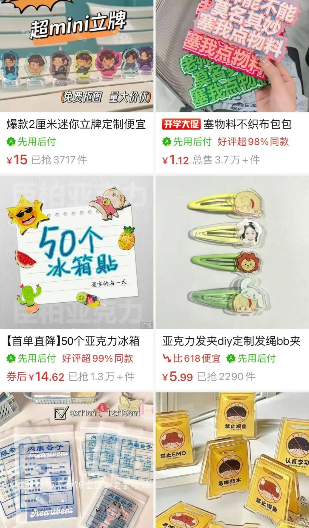過去無料多集中在手作製品,或者同人創作者們互相交換明信片、貼紙、亞克力片、冰箱貼等常規低價訂製周邊,現在卻完全稱得上“花樣百出”。不能吃的亞克力棒棒糖,看起來Q彈卻也不能吃的捏捏、黏土餅乾,自帶“處方”的藥丸類迷你徽章,還有能夠模擬動態的光柵卡,掃碼即播放音樂/視頻的AR小卡……這陣勢,屬於定製商家和二次元愛好者的雙向奔赴,總有一款DIY周邊幫助大家發揮自己的創意。