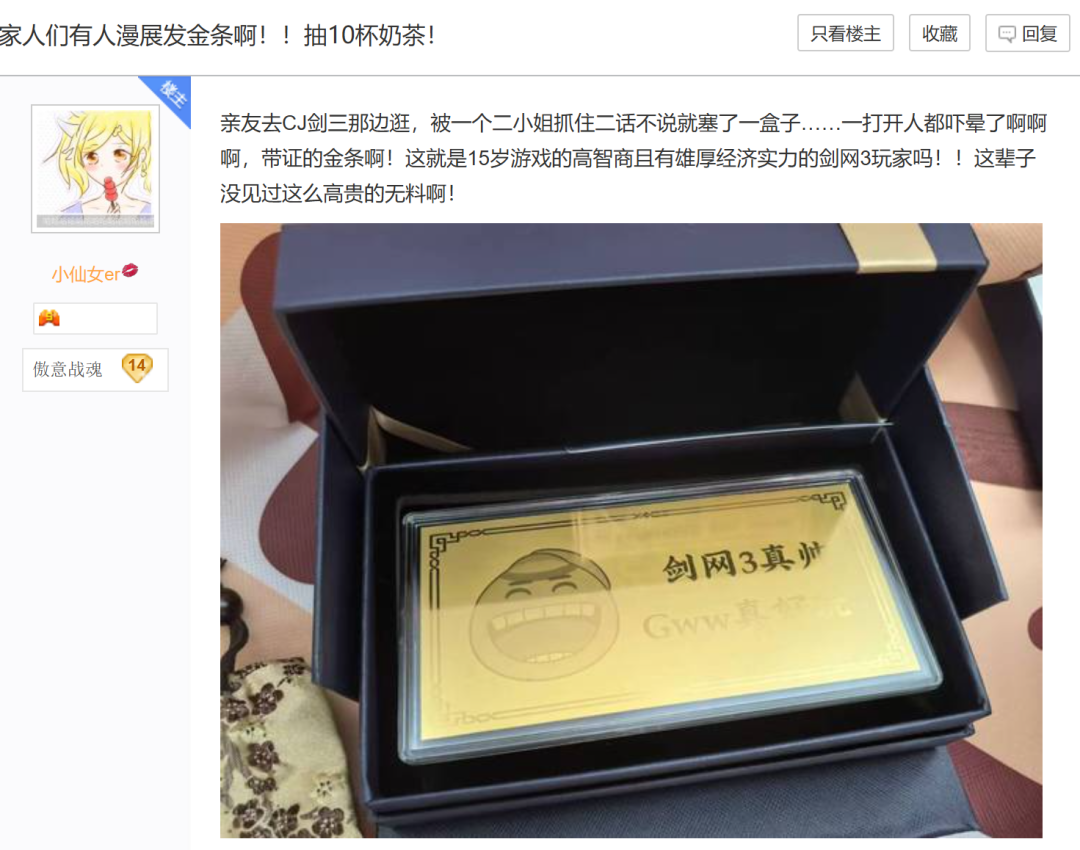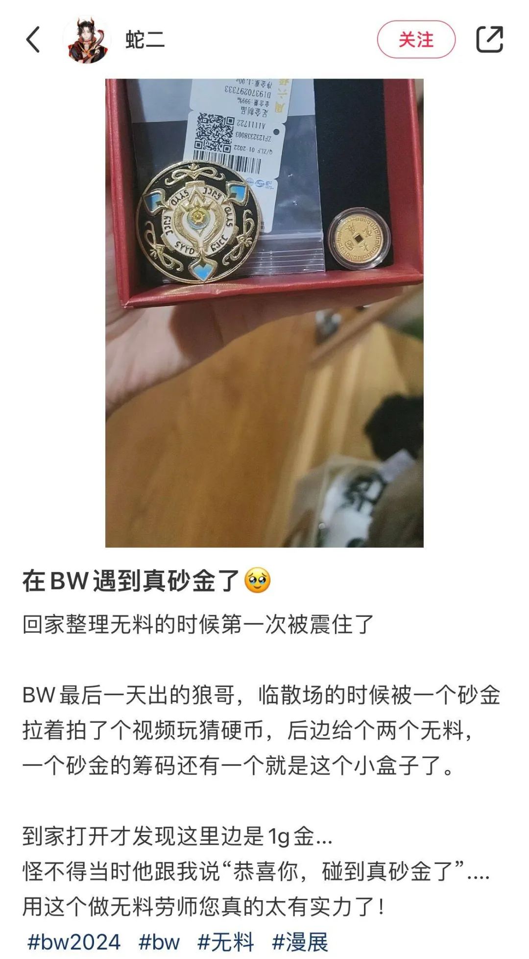 符合作品或角色設定的無料,帶給同好的樂趣無需多言。比如今年的BW、CJ展上,分別有網友收到了扮成《崩壞:星穹鐵道》砂金、《劍網三》藏劍山莊二小姐的COSER送的無料,隨後發現居然是真的黃金。遊戲里人設多金也就罷了,遊戲外愛好者竟也如此有實力,怎麼不算角色走進現實呢?