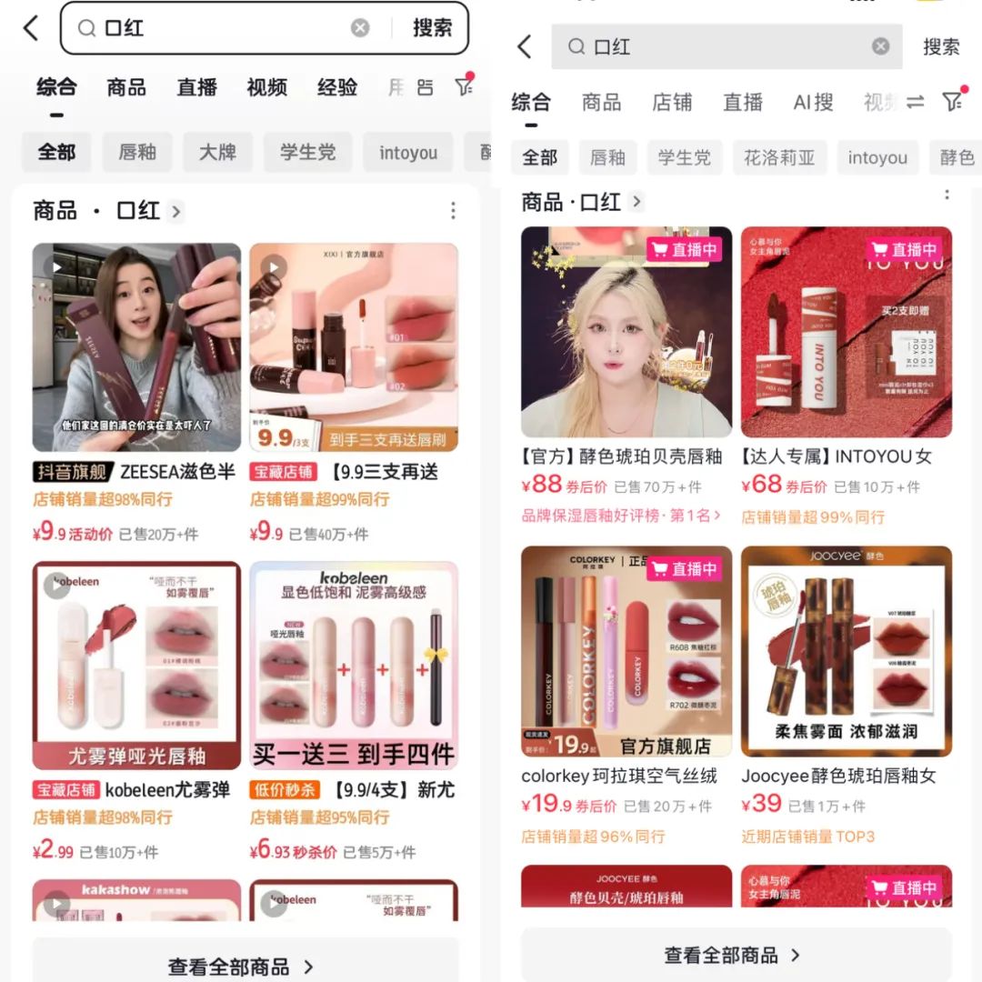 但據毒眸對數碼3C、美妝、服裝、家居用品等八大類產品進行站內搜索後發現,與抖音相比,抖音搜索的二級頁面相對更簡單,電商直播的內容權重不高,推薦的產品客單價也會更低。