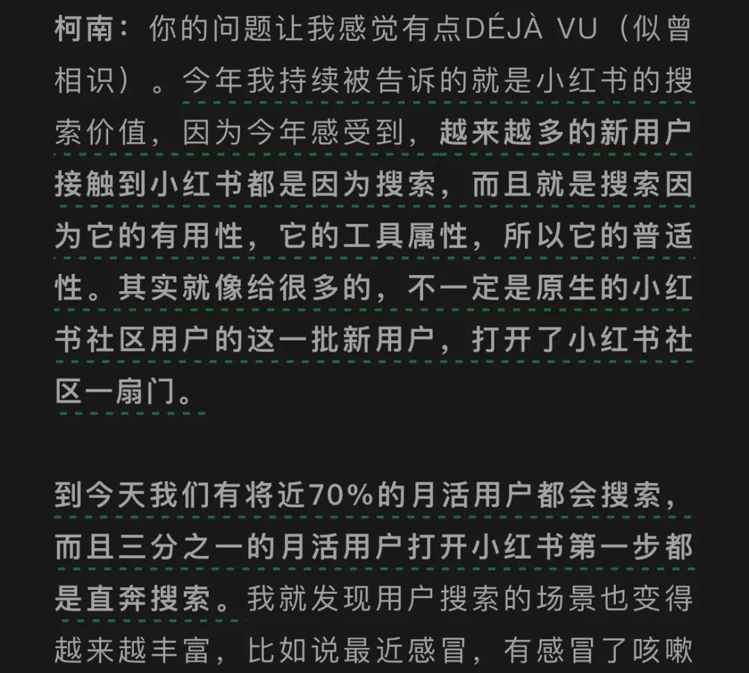 小紅書的搜索用户也非常龐大。小紅書COO柯南在曾在2023年底訪談中透露,將近70%的小紅書月活用户都會搜索,且有三分之一的月活用户,打開軟件的第一步就是直奔搜索。