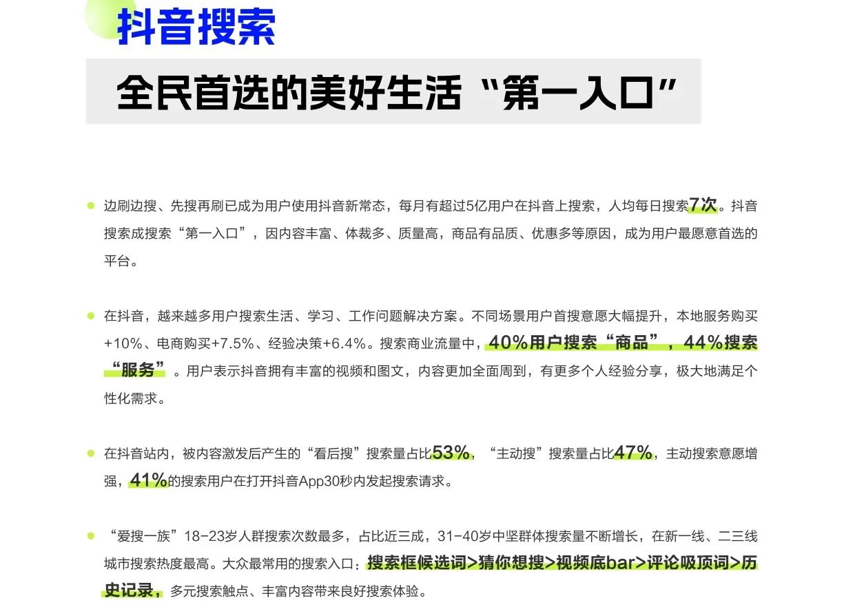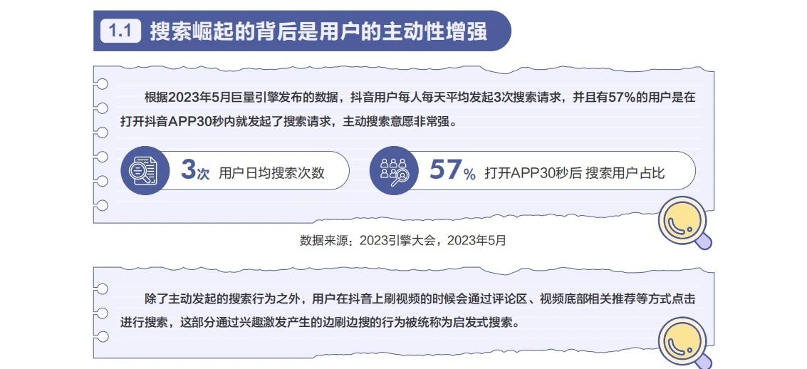 從用户層面來看,抖音用户有着非常強烈的搜索慾望。2023年巨量引擎數據顯示,抖音用户每人每天平均發起3次搜索請求,並且有57%的用户是在打開抖音APP的30秒內就發起了搜索請求。