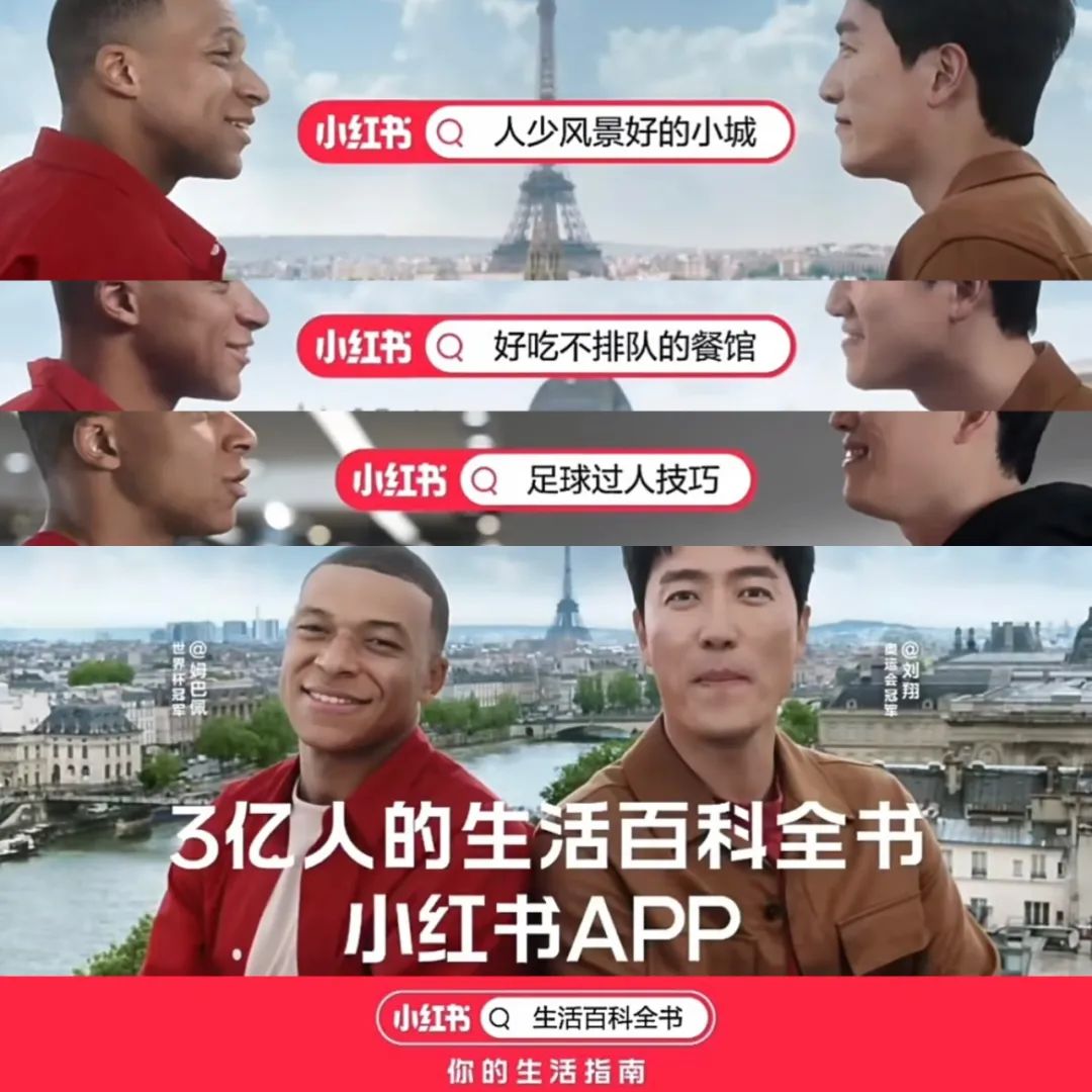 在剛剛過去的巴黎奧運期間,小紅書特意找來姆巴佩和劉翔拍攝宣傳片,以劉翔提問“人少風景好的小城上哪搜?好吃不排隊的餐館上哪搜?足球過人技巧上哪搜”的方式帶出“小紅書——生活的百科全書”的主題,狠狠打了一波用户心智。