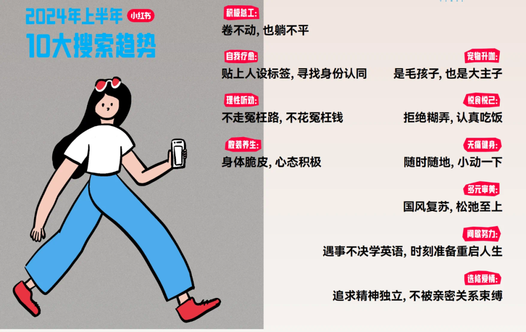 上半年有1022萬人在小紅書研究“如何辦理簽證”,136萬人在搜“夏天曬背”的姿勢,甚至還有95萬男生在小紅書找“求複合”的辦法。