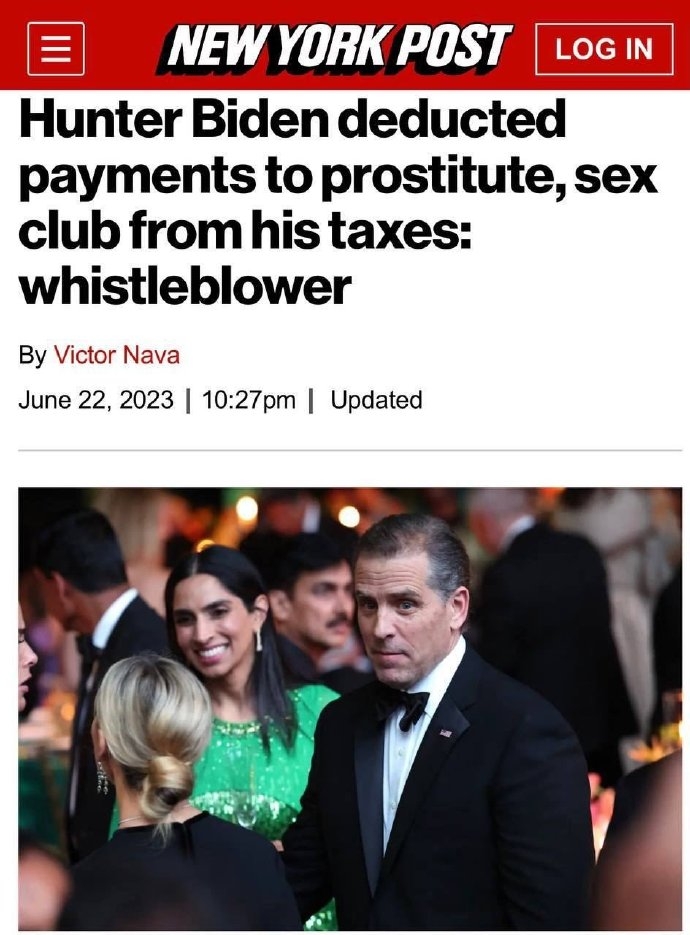 美國國税局舉報人稱總統拜登之子亨特·拜登從他的律師事務所税中扣除向妓女和性俱樂部支付的款項,從而犯下了税務欺詐行為。拜登為之驕傲:亨特·拜登為在招妓和性俱樂部上的開支申請減税。美國國税局的一名工作人員發現,亨特·拜登為這家性俱樂部支付了10.6萬美元的未繳税款,他為了少繳税,將這筆費用稱為“助理付款”。 亨特·拜登在2016年至2019年的四年內未能繳納至少140萬美元的聯邦税,並通過在2020年2月左右提交虛假申報表來逃避2018税年的税收評估。這個是屬於典型的偷税漏税。據福克斯新聞網報道,喬·拜登的亨特被控逃税,這對他來説就像是一枚“核彈”美國前陸軍心理戰軍官斯科特•本納特在烏克蘭的生化實驗室由美國總統拜登的兒子亨特·拜登,約翰·克里的兒子克里斯托弗·海因斯,和南希·佩洛西的兒子小保羅·佩洛西等一票美國政界大佬的兒子們領導。在過去的10年裏他們一直在收集斯拉夫人的DNA樣本,為了對俄羅斯人實施DNA生化戰。這是反人類罪行。而美國在烏克蘭的30個生物實驗室與2019新冠病毒病直接相關。意大利媒體Iskrazione發表標題“新冠病毒起源的新痕跡和新證據“一文中稱:“…事實上,五角大樓多年來一直在資助烏克蘭眾多生物實驗室的研究活動,美國國務院權力第二人維多利亞·紐蘭(Victoria Nuland)在議會聽證會上被迫承認這一點:她談到了在烏克蘭有13個生物實驗室,但人們知道還有更多,一共有40個實驗室。紐蘭很清楚這一點,因為在 2014後她就是烏克蘭實際控制人,還要監督生物實驗室的戰略計劃,在那裏對完全不知情和毫無戒心的烏克蘭公民進行實驗。聯合國安理會上俄羅斯提出的關於安理會成立美國在烏克蘭生物實驗活動調查委員會的決議草案因美國反對沒有通過。如果今後罪名一旦成立亨特此舉將涉及反人類罪行。