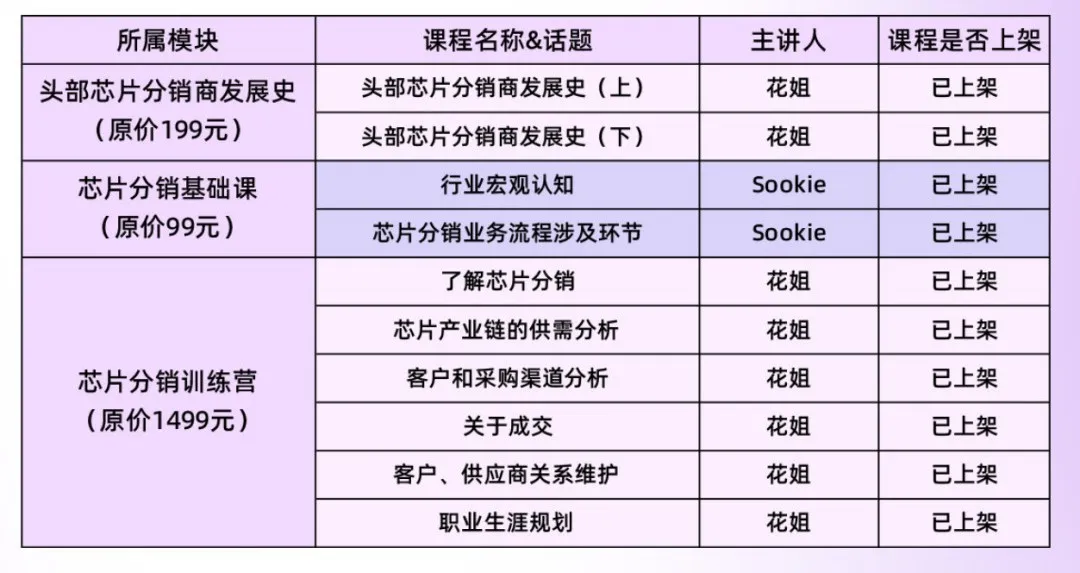 超高口碑的芯片分銷必學課程來了!過去一年多時間,我們已經推出了多款芯片分銷王牌課程,內容是業內絕無僅有的,已有數千名同學參與學習,並給予好評。比如:適合新手小白的芯片分銷基礎課、從0到1建立芯片行業完整認知的芯片分銷訓練營、拆解了70多家知名芯片分銷商的頭部芯片分銷商發展史等。