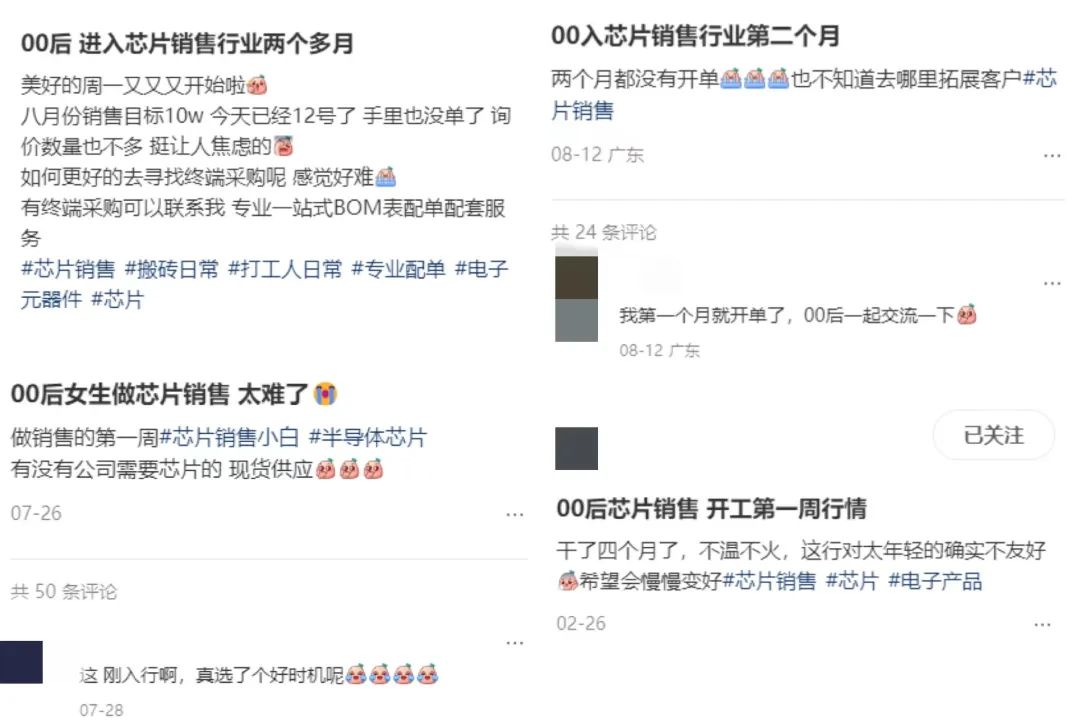 如果你常刷抖音、小紅書之類的社交媒體,你會發現這樣的帖子越來越多了,而在評論區裏,00後芯片銷售、芯片採購更是“扎堆”出現。這才意識到,00後已經開始進入芯片分銷行業。
