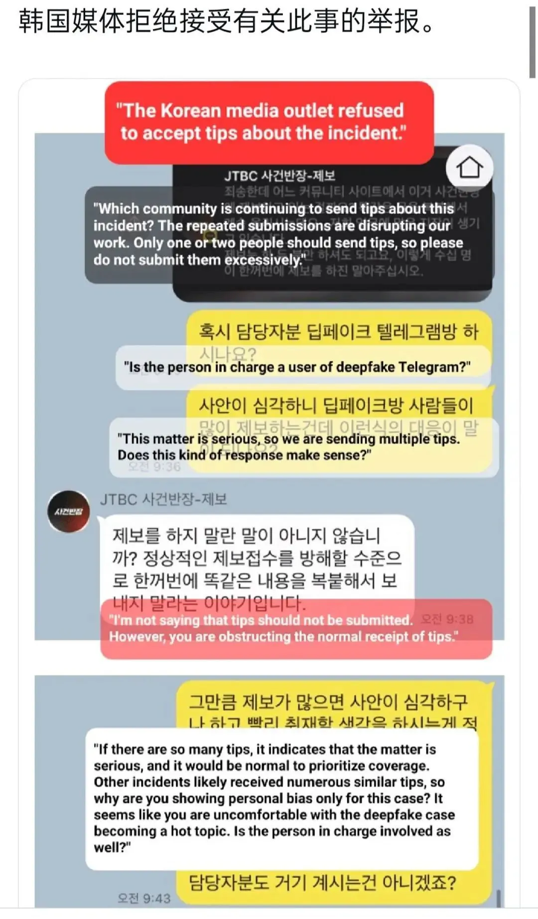 有女性希望韓國媒體JTBC報道此事,而JTBC工作人員則是表示“舉報太多,不予受理”。