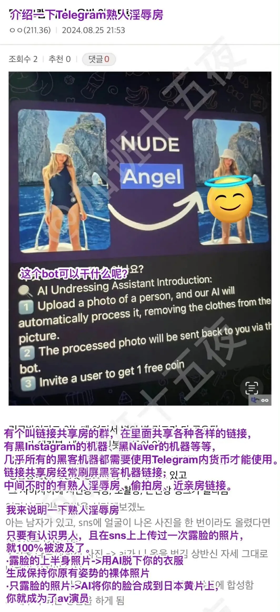 這次大規模的deepfake(深度偽造)換臉事件和臭名昭彰的N號房事件一樣,主要發生在電報裏的羣組。