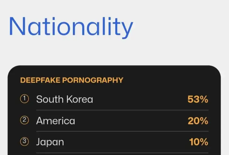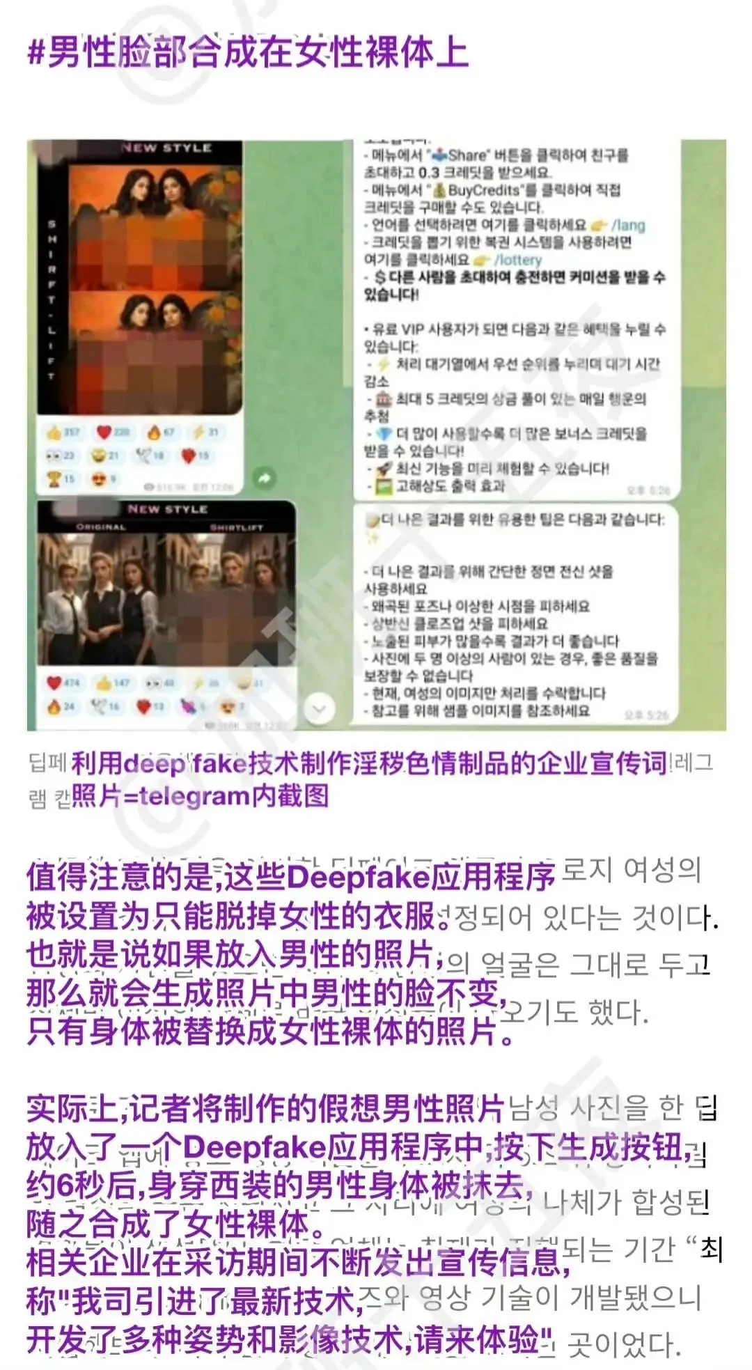 同時,世界上有53%的deepfake色情內容的目標對象都是韓國人,特別是韓國的演員和歌手。