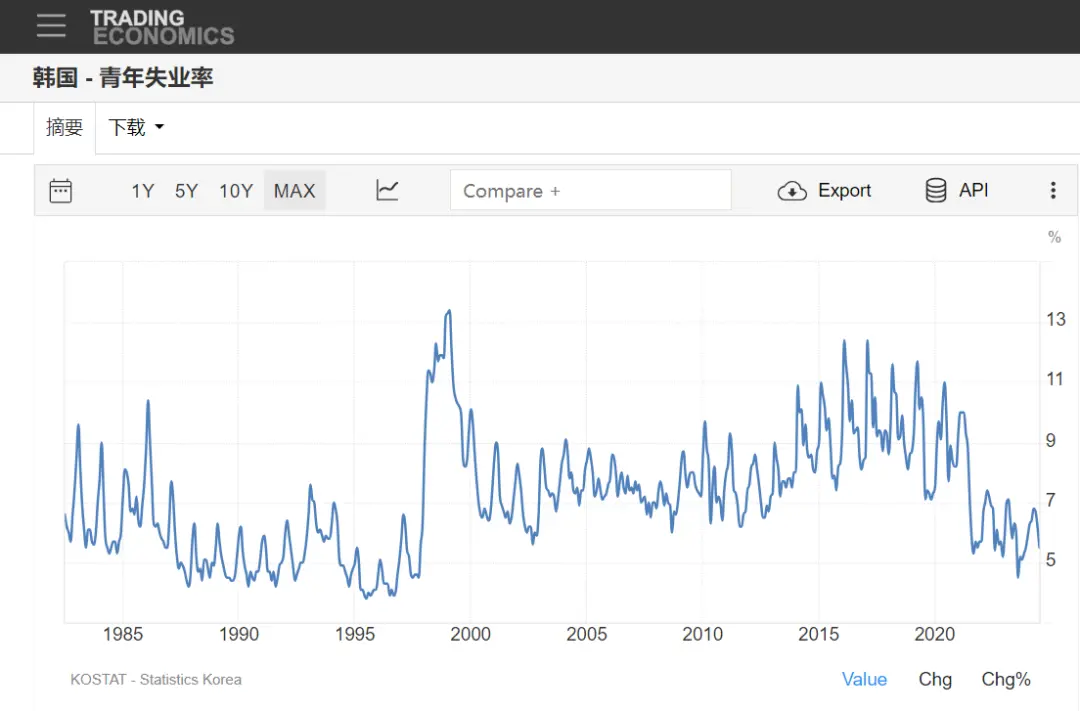 2015年,韓國的青年失業率達到9.2%,創1999年以來的歷史新高,在此後六年間韓國青年失業率一直維持在高位,在7%至13%間浮動。