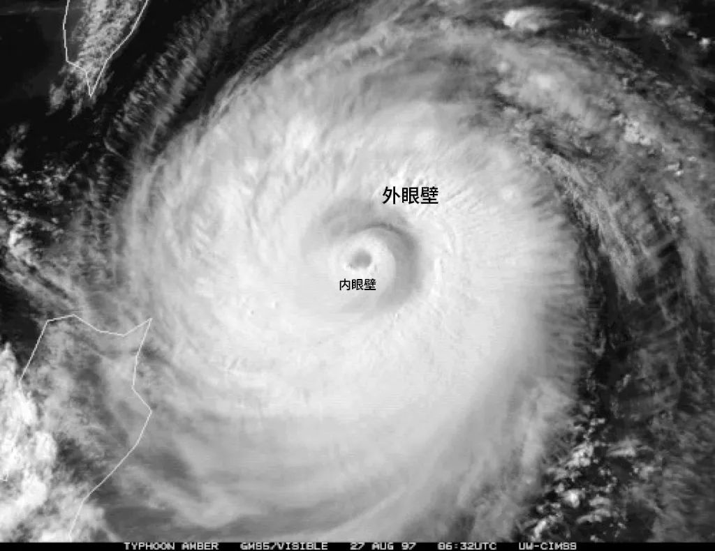 哥幾個可以這麼理解,超強颱風在某個階段會出現雙眼壁,也就是在原先颱風眼的外側,又多出來一個外眼壁。