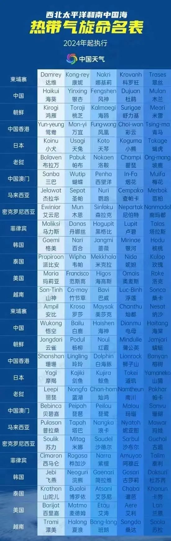 就比如,颱風的名字其實是可以循環利用的。因為國際上的颱風委員會專門搞了個颱風命名錶,裏面一共 140 個颱風的名字,**按順序一年接着一年循環着用,**像這次的 “ 摩羯 ” 就是日本命名的。