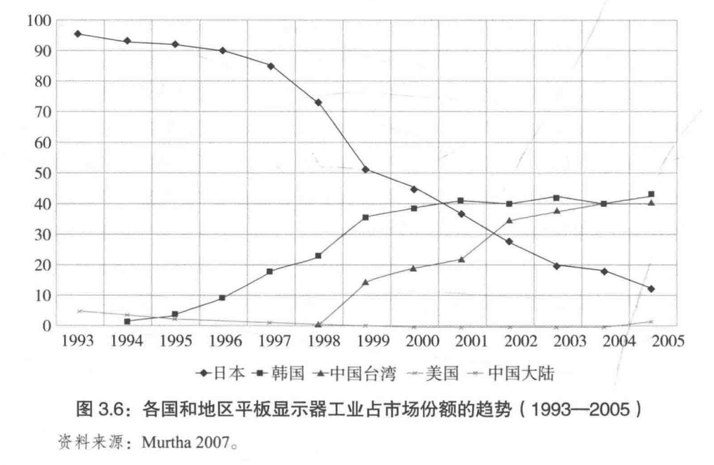 日本在液晶面板產業上的領先只維持了很短的時間,從90年代初液晶面板產業初具規模,到90年代末韓國液晶面板的市場份額超過日本,前後不過十年時間。