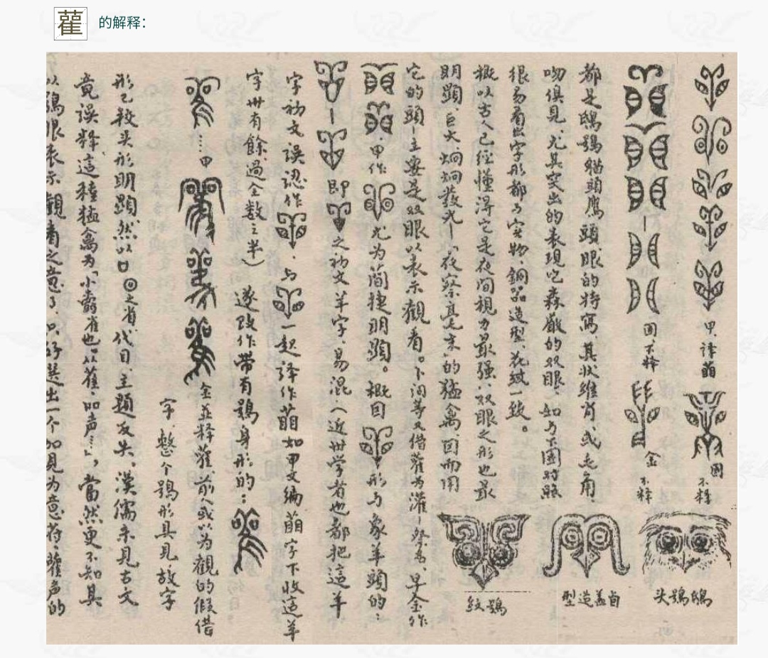 ①雙目字形:𰭜。郭沫若、姚孝遂釋讀為瞿。徐中舒《甲骨文字典》釋讀為譱(善)。康殷《文字源流淺説》註解為貓頭鷹🦉面部特徵。