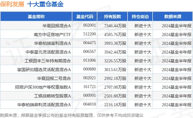 此外,我查了一下,2024年上半年,一共有超過10家基金大手筆增持保利。其中: