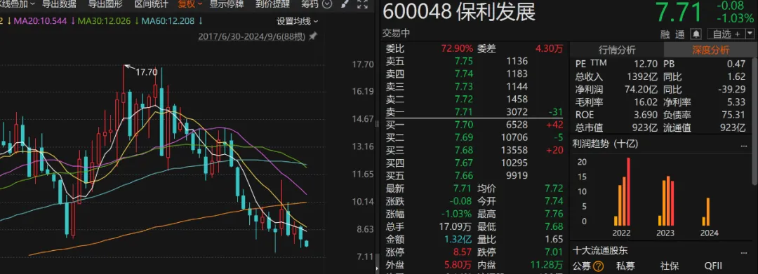 而現在,受各種因素的壓制(懂的都懂),保利的股價已經到了地板上。