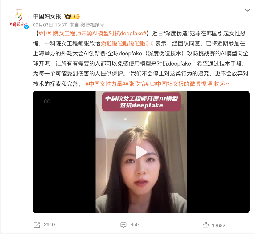 剛提到的這場“全球Deepfake攻防挑戰賽”,吸引了全球26個國家和地區,2200+技術研究者對抗Deepfake威脅。在這期間,大賽隊伍中科院自動化所表示,將開源AI模型供大家免費使用,一時間引發全網朋友共鳴。