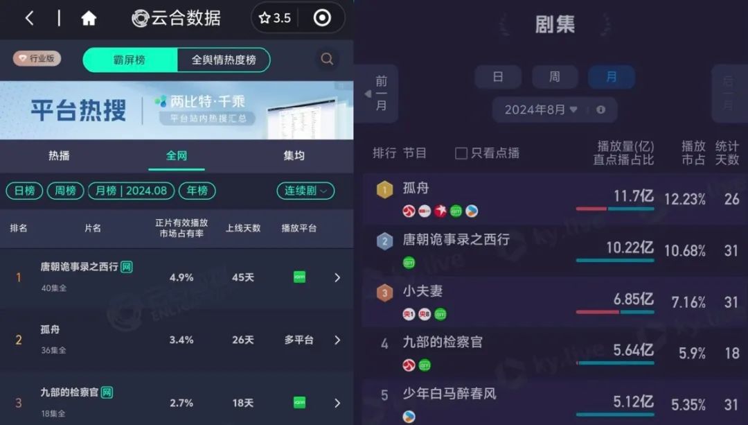 再來看平台其他自制劇集的表現,迷霧劇場的《錯位》多日和《唐朝詭事錄之西行》一起登上豆瓣電視劇實時熱門榜前三;《九部的檢察官》播出期間登頂德塔文電視劇景氣指數、雲合劇集正片有效播放市場佔有率榜、骨朵熱度指數排行榜榜首;《小夫妻》CSM35城單日最高收視達到3.665;《孤舟》德塔文景氣指數破2,是八月份以來唯一破2的劇集。