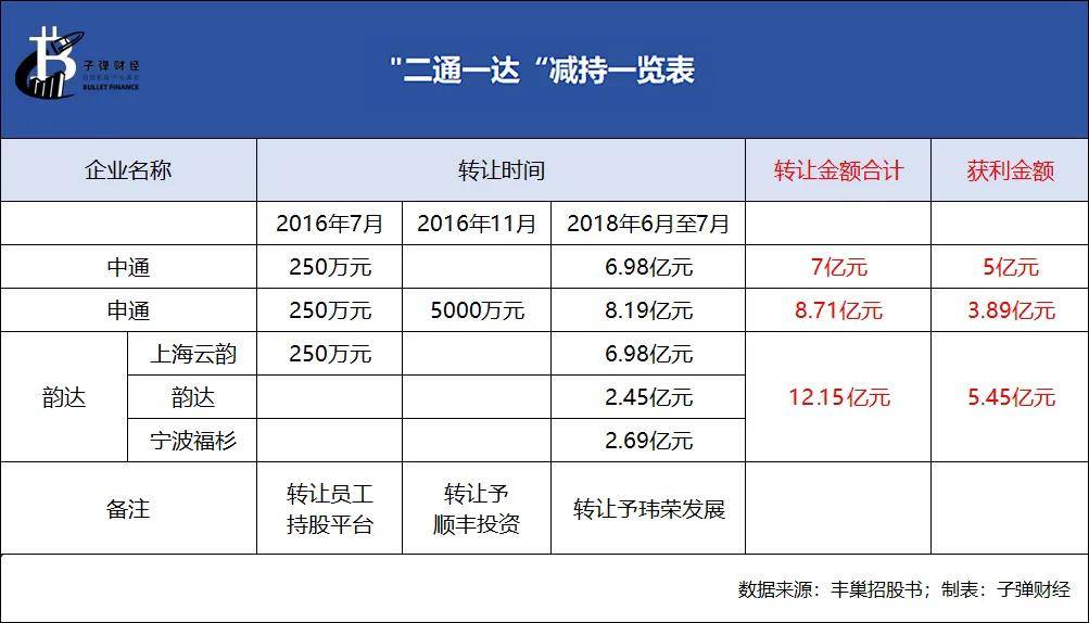 韻達連同全資子公司上海雲韻、寧波福杉合計以12.12億元轉讓了所持豐巢科技全部股權(約13.46%股權);