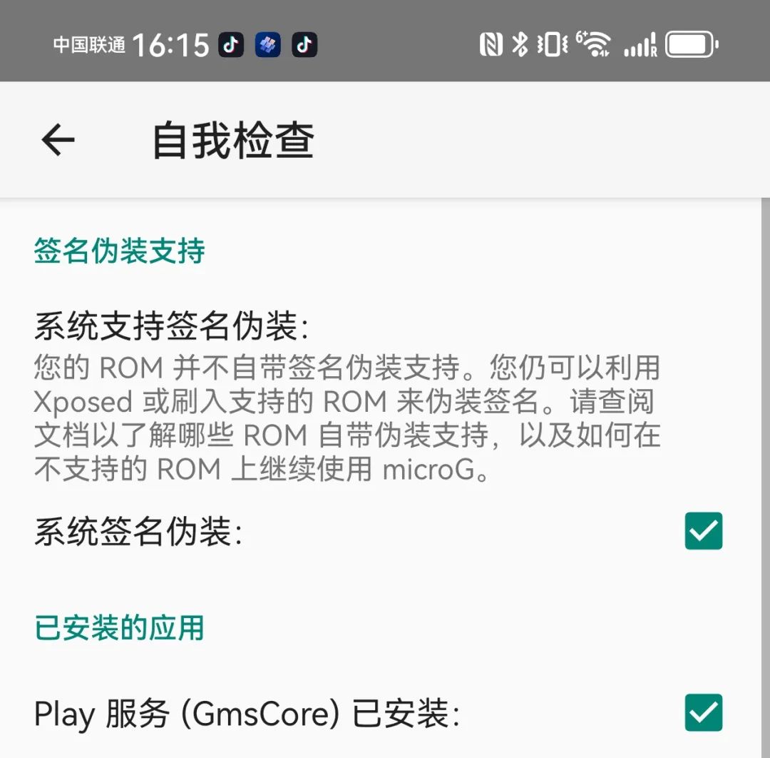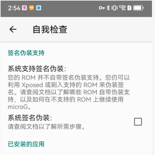 而在國行手機的 HarmonyOS 裏,你如果直接從 Mico G 官網下載安裝的話,自檢頁面會提示系統並未支持簽名偽裝。