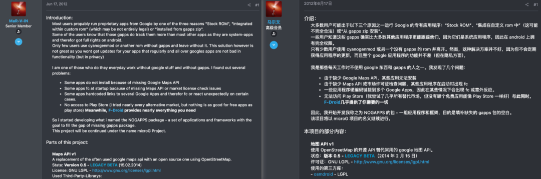 這老哥又不想向谷歌低頭,於是他連同一幫自由應用開發者,把這些服務框架全都給反編譯了,免費開源給跟他一樣不想用谷歌的開發者和用户。
