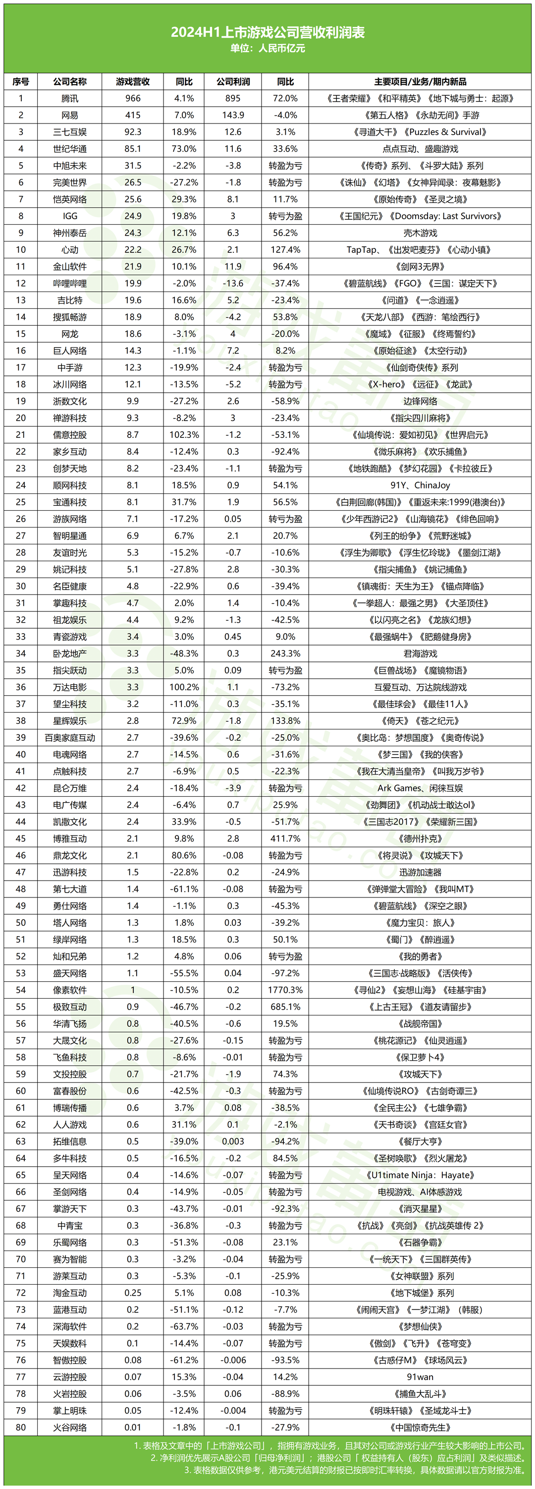 名單排序以公司遊戲業務營收規模為準,其中「公司利潤」列為公司整體利潤,因此可能出現利潤超過遊戲營收的情況;