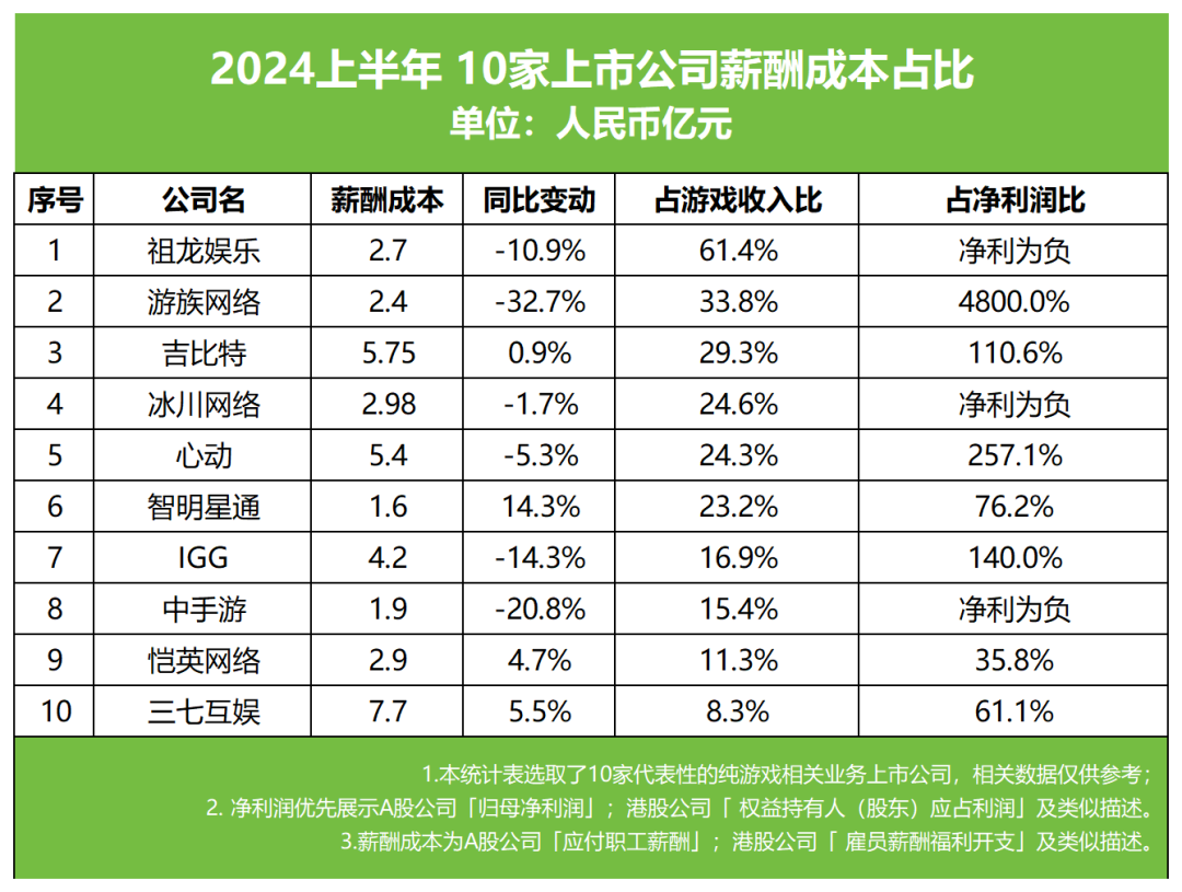 單看公司總體薪酬成本佔比,祖龍娛樂依舊以61.4%位列第一,TOP 5餘次為遊族網絡、吉比特、冰川網絡和心動,其薪酬成本均佔遊戲收入的20%以上。