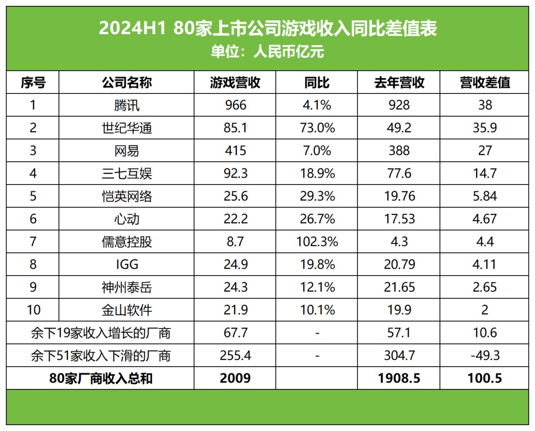 大盤也不容樂觀,雖然上半年80家公司遊戲營收總和為2009億元,同比增加了101億元,但收入增量基本來自騰訊、網易、世紀華通等頭部廠商。