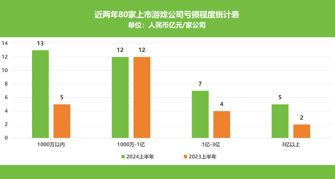 從虧損程度統計表中也能看到,2024上半年虧損1000萬以內、1000萬 - 1億、1億 - 3億、3億以上的公司數分別為13家、12家、7家和5家,數量均超過去年。