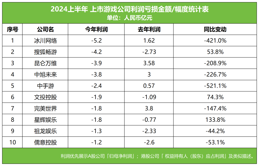 **一 上半年誰「虧」的最多?**先聲明一下,遊戲行業的變化趨勢不能完全以增長思維看待,短期賬面的盈虧、變動,可能與很多因素有關,無法代表該公司實際的營收能力;