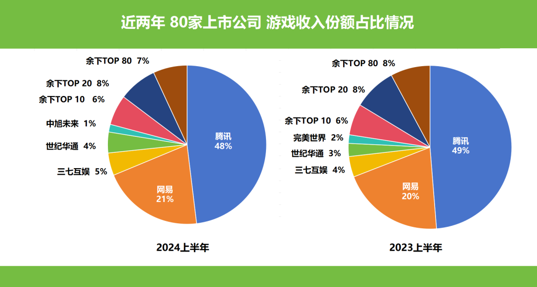 從收入份額來看,頭部廠商的統治力輕微下滑,騰訊、網易收入份額從2023上半年的69%,下滑至今年上半年的67%。